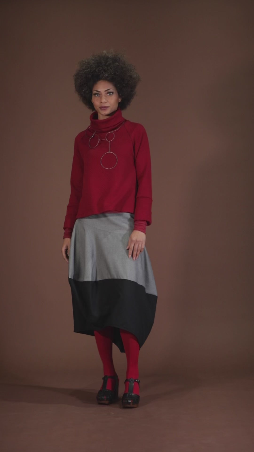 Gonna asimmetrica, a palloncino, con fondo in tessuto a contrasto.
