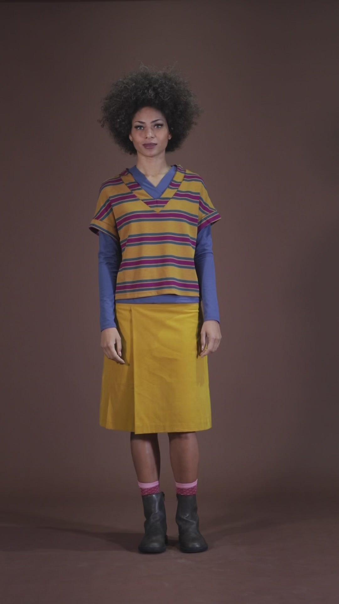 Gonna al ginocchio, svasata, con cinturino alto e piega sul davanti.