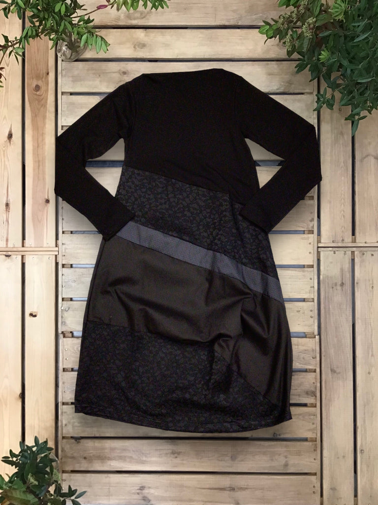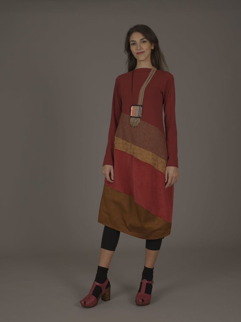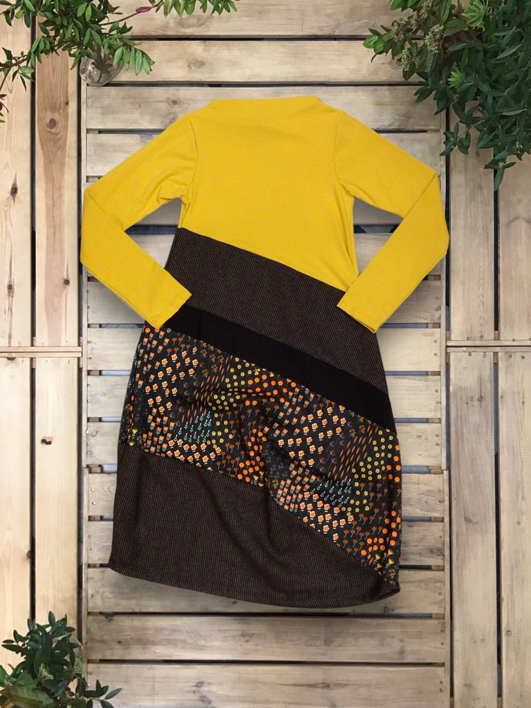 Abito a palloncino in jersey di cotone con fondo pachwork in tessuto a contrasto.