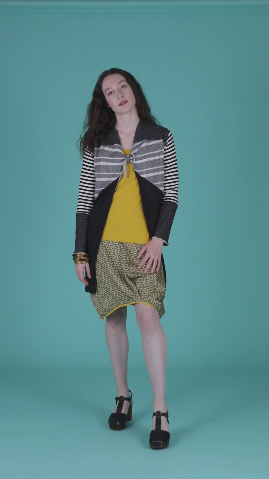 Cardigan patchwork lungo, con linguette da annodare sul davanti.