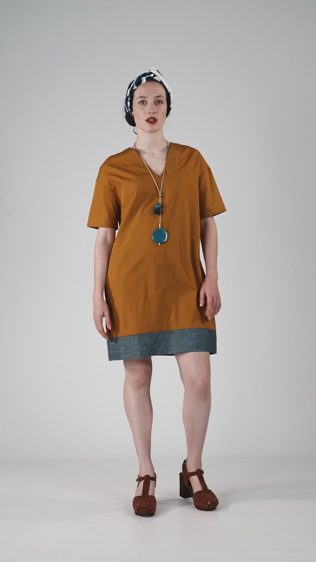 Abito ampio, a scatoletta, con scollo a V davanti e dietro, tasche laterali e dettagli a contrasto.