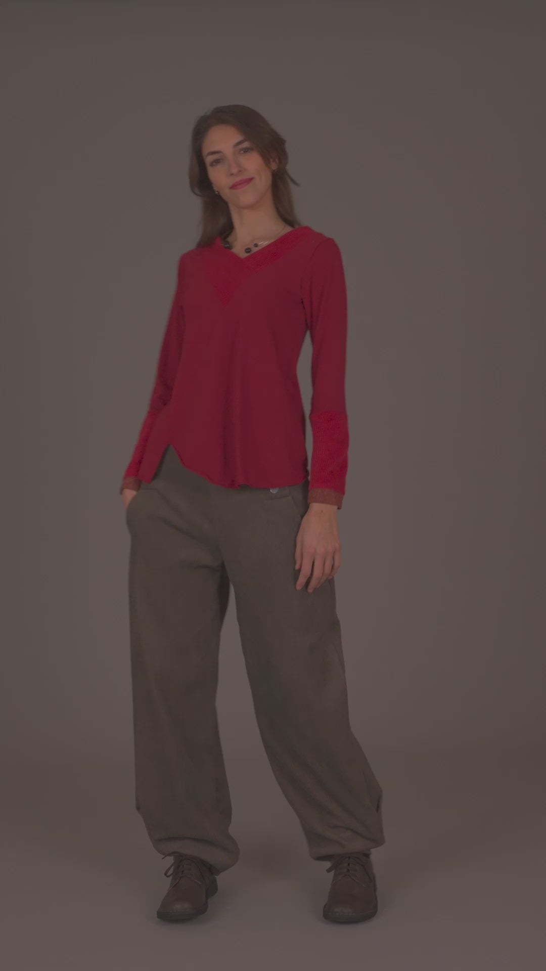 Maglia con taglio assimetrico e spacco sul davanti, e con inserti in tessuto a contrasto sul collo e sul fondo manica.