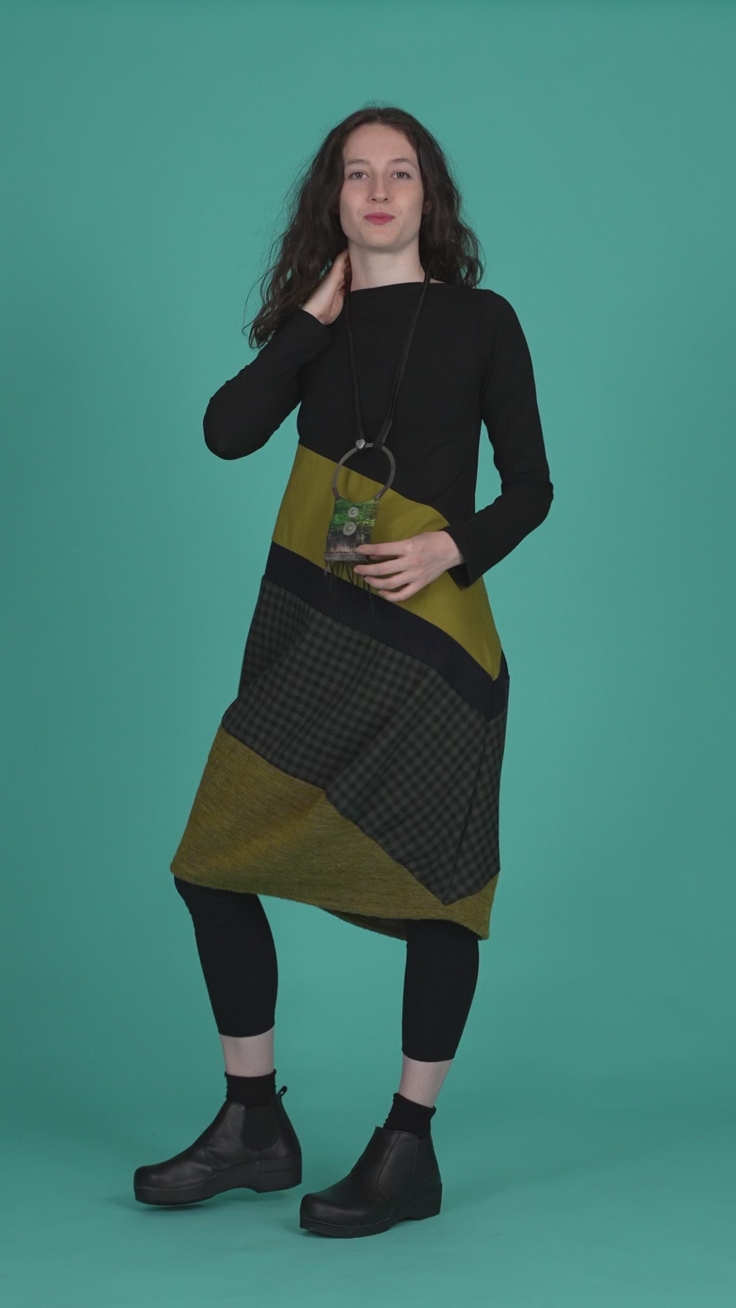 Abito a palloncino in jersey di cotone con fondo pachwork in tessuto a contrasto.