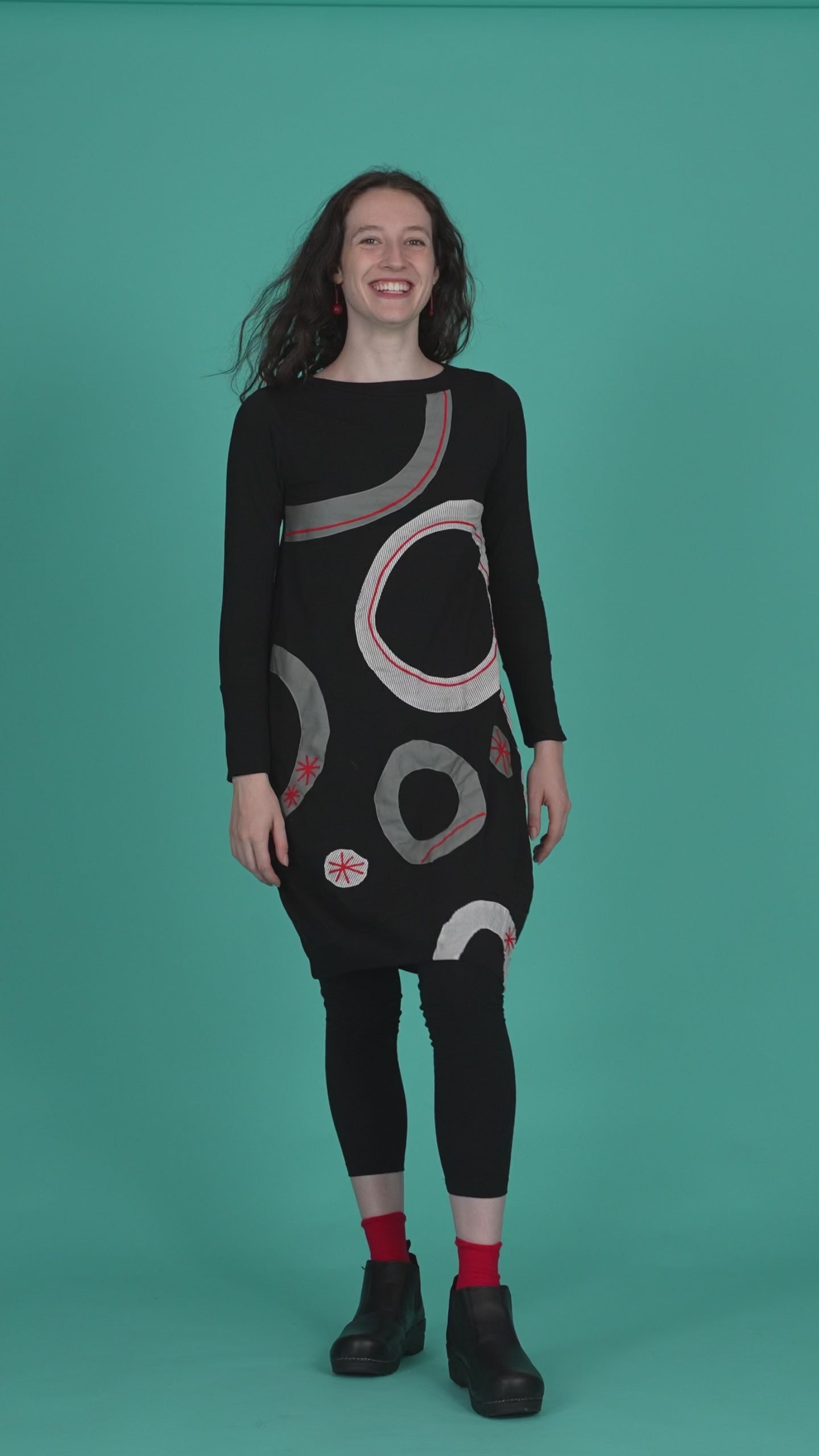 Abito asimmetrico in jersey, con applicazioni di tessuto e filo di lana a contrasto.