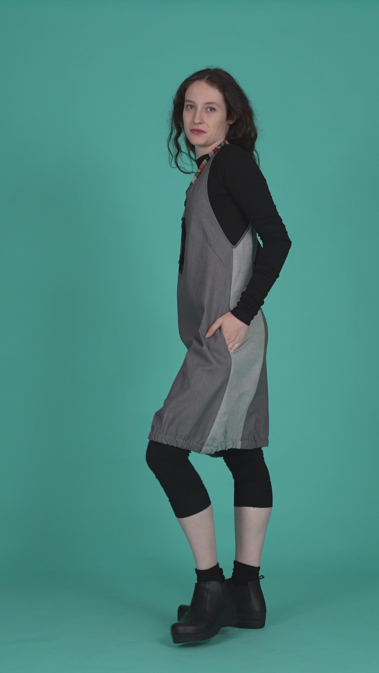 Salopette a palloncino con inserti di tessuto e bordini a contrasto.