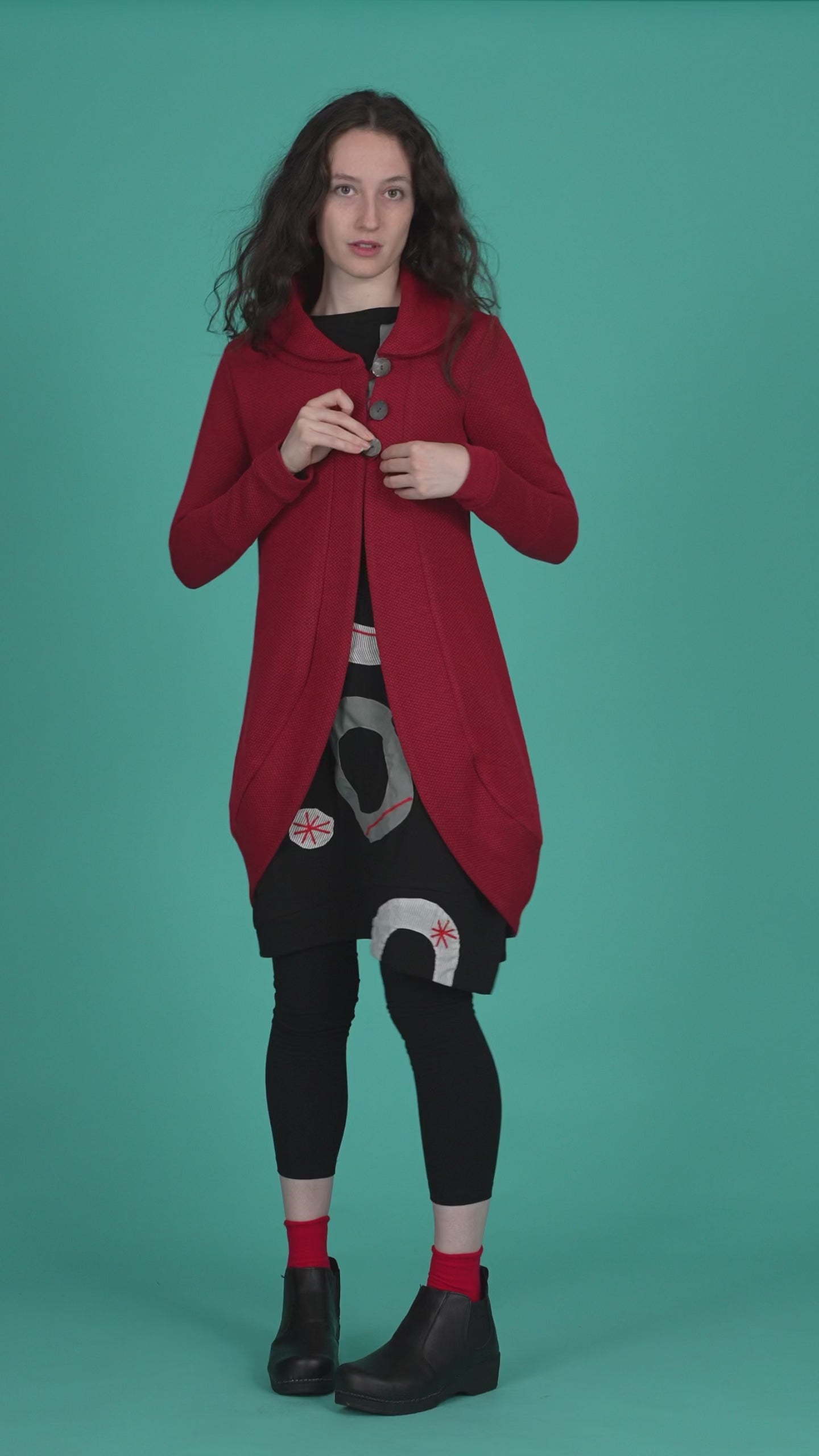 Cardigan lungo, asimmetrico, chiuso da tre bottoni di madreperla. Taglio a palloncino.