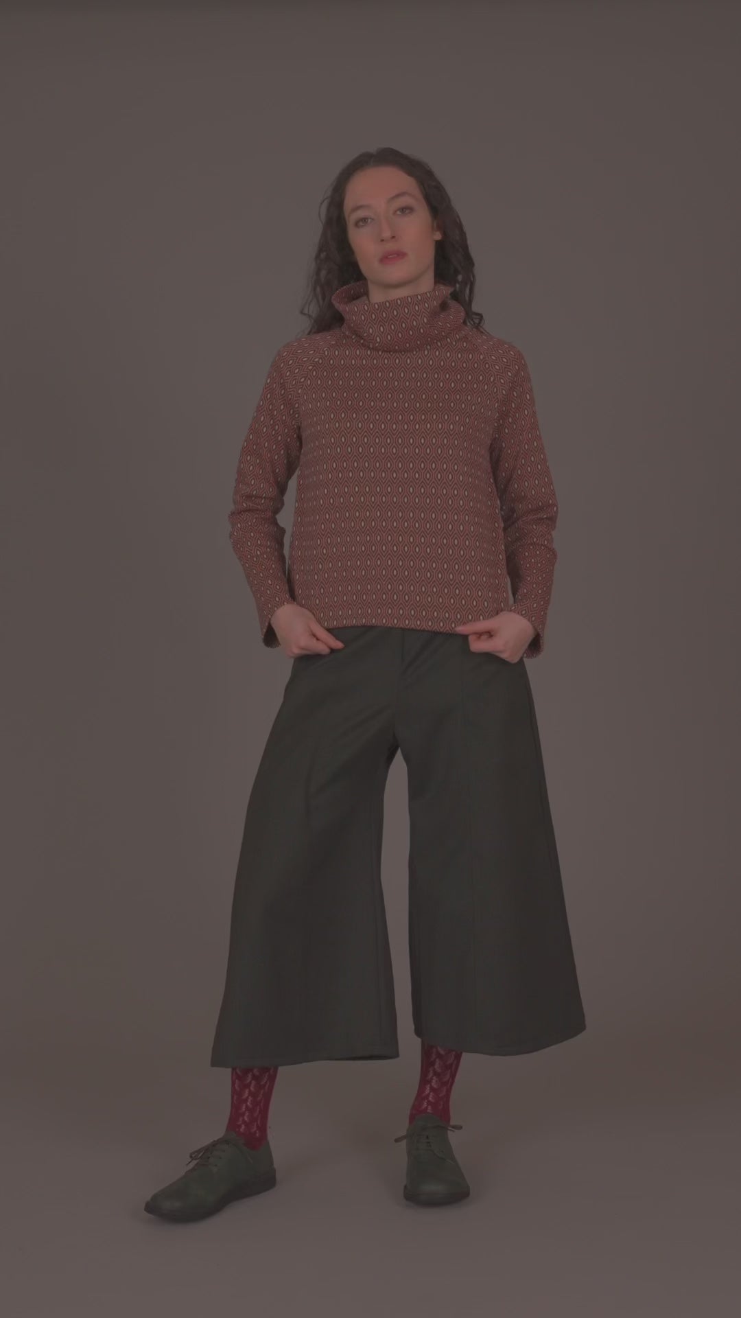 Golf svasato a collo alto con piccoli spacchi sui fianchi.